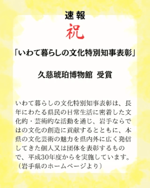 2025年11月3日 【 博物館 】「いわて暮らしの文化特別知事表彰」久慈琥珀博物館が受賞しました!詳しくはこちら2025年10月20日 【レストラン】テイクアウトメニュー が新しくなりました!