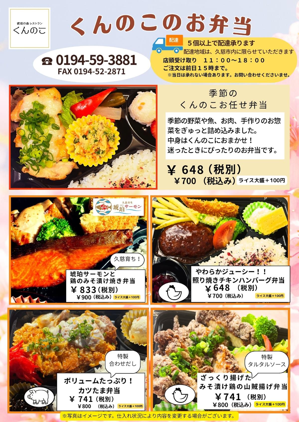 久慈育ち琥珀サーモンを使用した、くんのこならではの和風弁当。チキンも入っておかずをたっぷり楽しめます。
